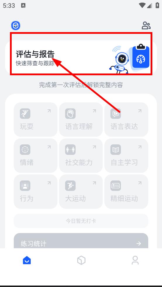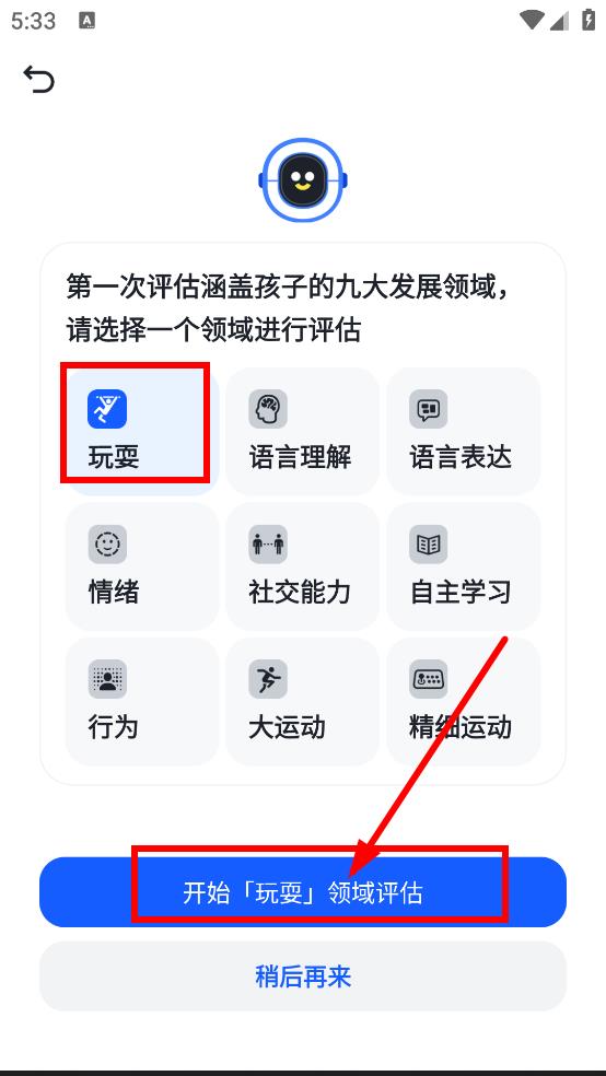 2、在提示页面,点击开始评估,进行第一次涵盖孩子九个发展领域的评估。