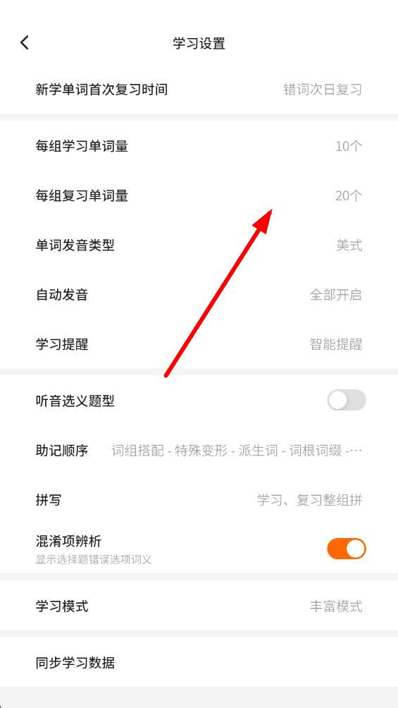 3、在学习设置页面里,找到每组学习单词量以及每组复习单词量选项,点击对应选项右侧数值,根据自己的需求设置每日学习和复习的单词数量,完成每日单词量的设置。