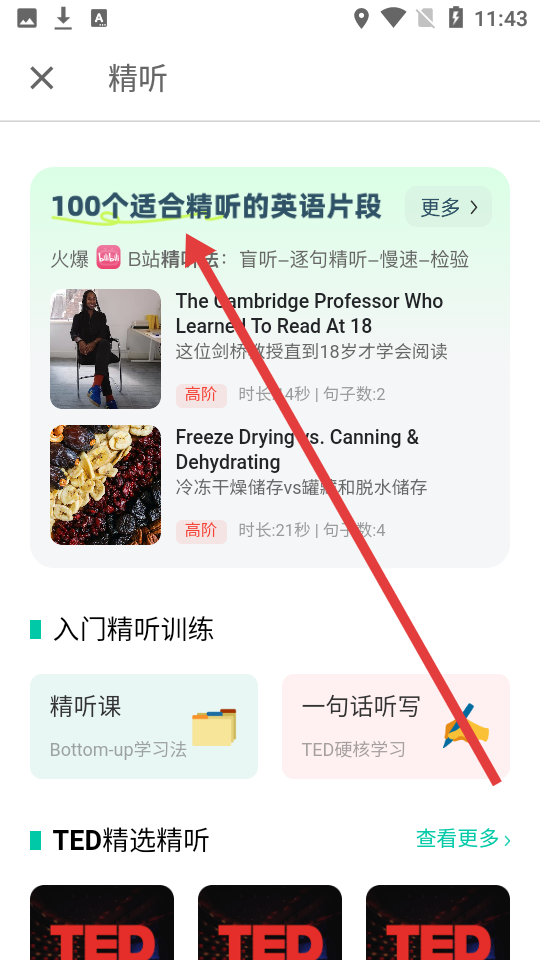 2、在精听页面中,找到想要精听的英语片段栏目,点击更多选项查看更多精听内容。