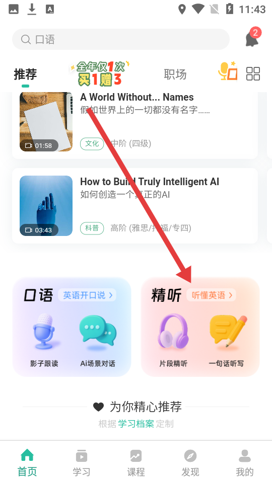 1、打开扇贝听力APP,在首页点击精听板块进入精听页面。