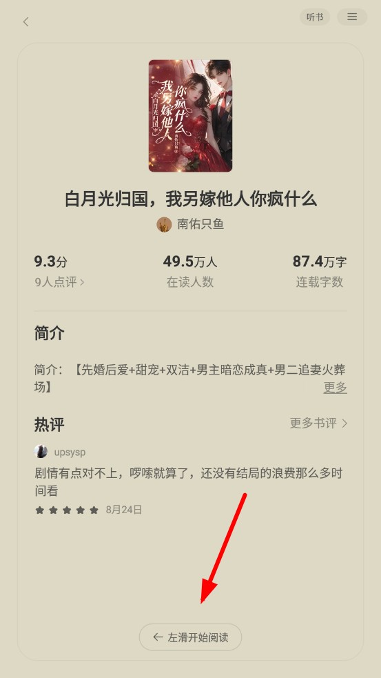 2、进入小说详情页面,向左滑动屏幕,进入小说阅读界面。
