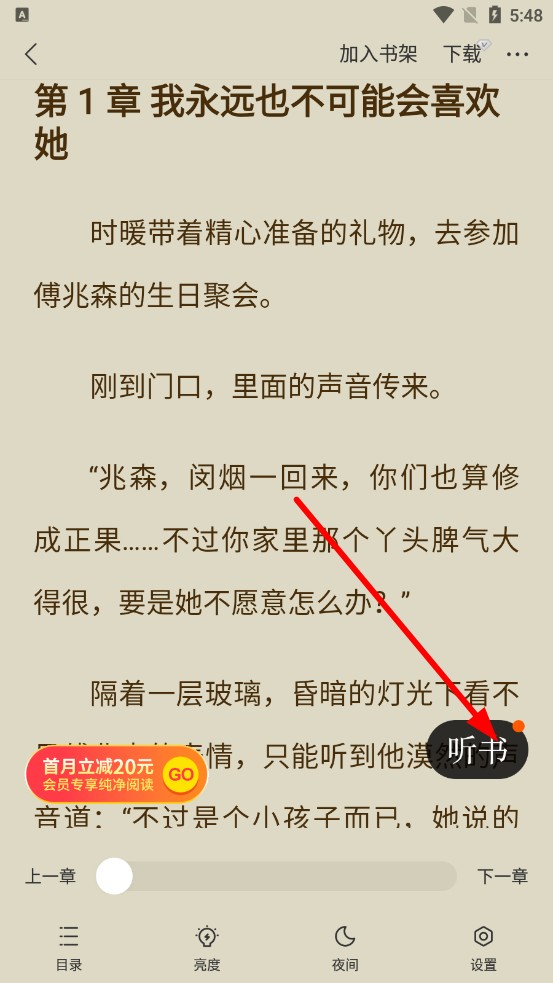 3、进入小说阅读界面后,点击听书按钮,小说便会开始朗读。