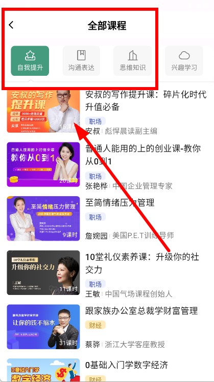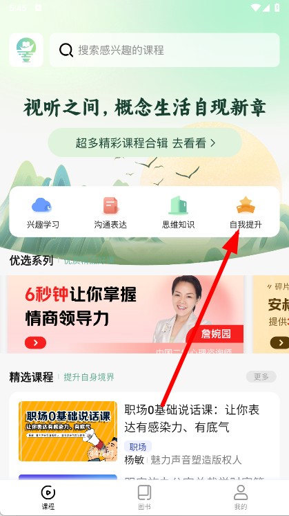 1、打开APP,在首页点击自我提升,进入课程分类列表页。