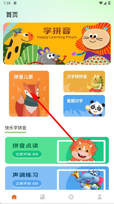 2、学练结合强化记忆:每个知识点后有卡通小游戏式练习,如找出听到的拼音,在玩中检验效果,强化记忆,避免学完即忘,形成学-练闭环。