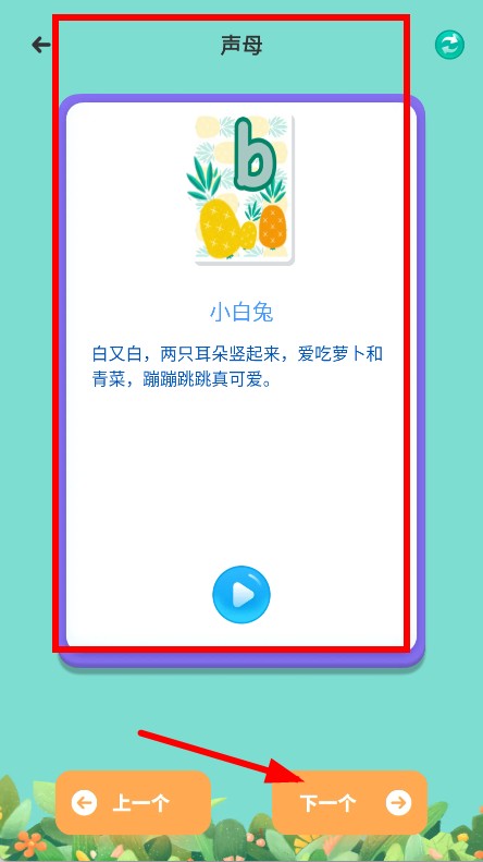 3、查看声母b的相关内容,点击下一个按钮,能继续学习其他声母。