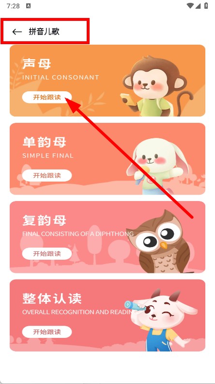 2、在拼音儿歌页面,选择声母分类下的开始跟读按钮。