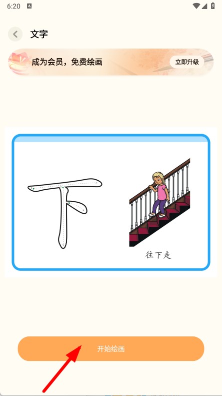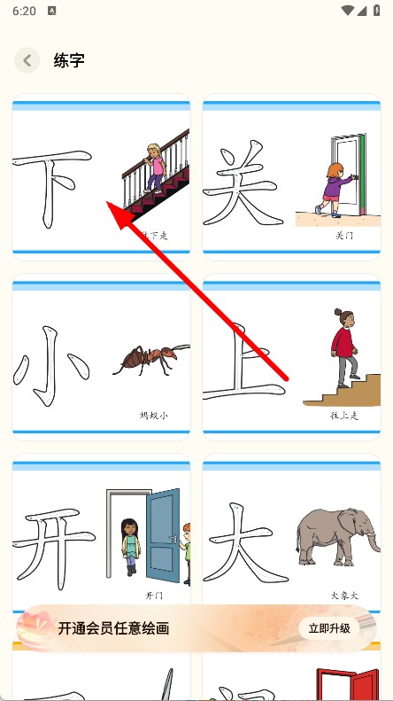 2、进入练字页面后,选择带有往下走配图的下字卡片。