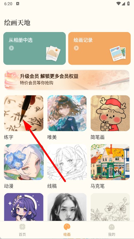 1、在软件的绘画页面,点击练字选项。