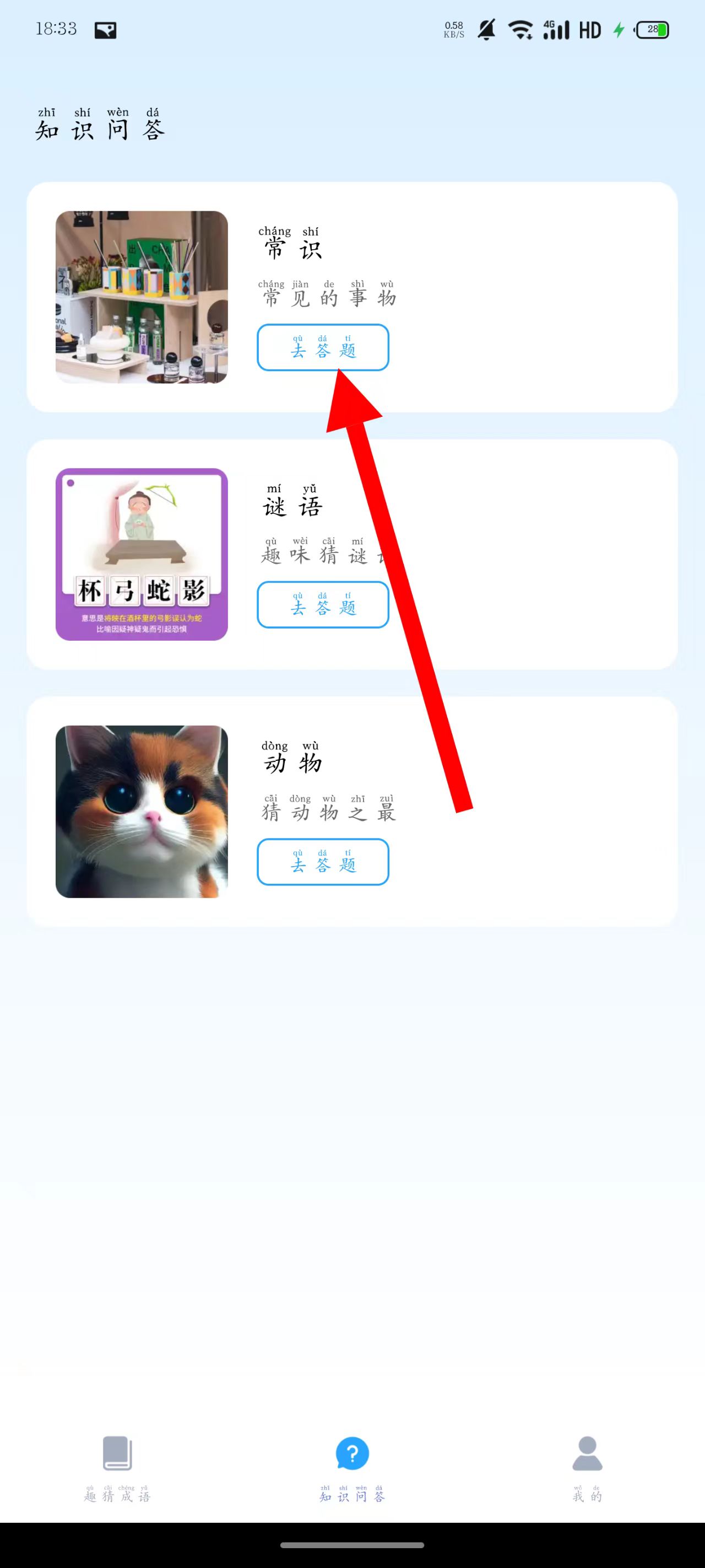2、在知识问答页面,找到常识板块,点击去答题按钮,进入常识答题界面。