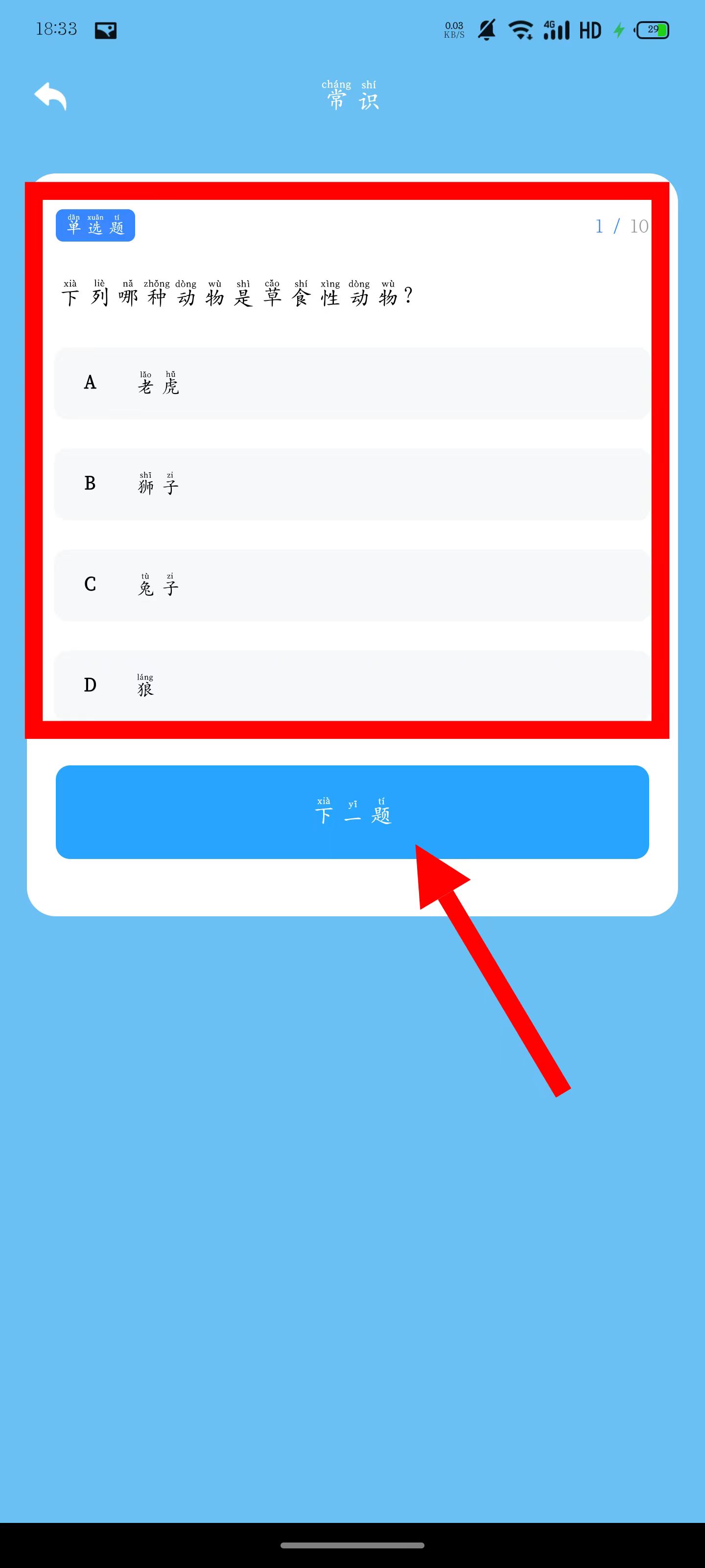 3、展示常识类单选题,完成当前题目作答后,点击下一题,继续参与常识题目答题。