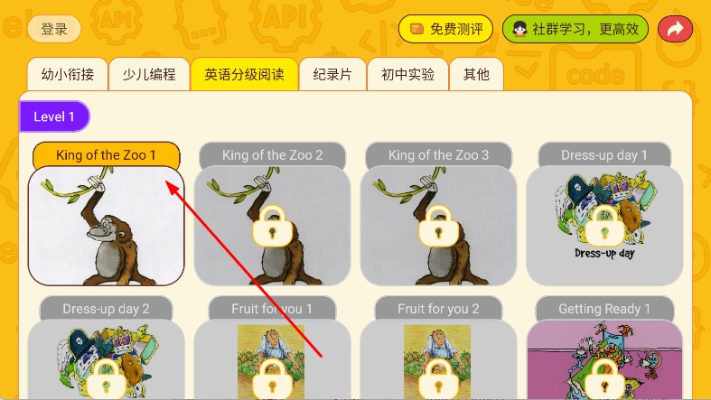 3、完成阅读学习后,可返回选其他分级阅读内容,持续通过趣味故事、互动功能,提升英语阅读和词汇学习能力。
