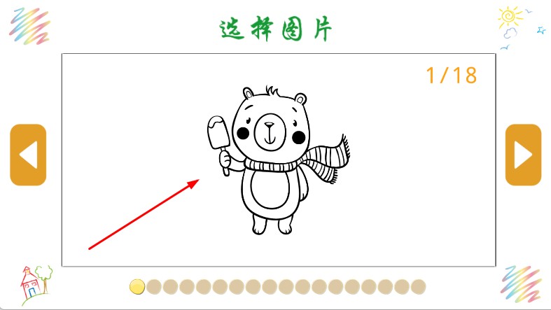 1、打开动物画画填色,进入选择图片页,浏览卡通图案,如拿冰棍的小熊,左右切换选想填色的图。