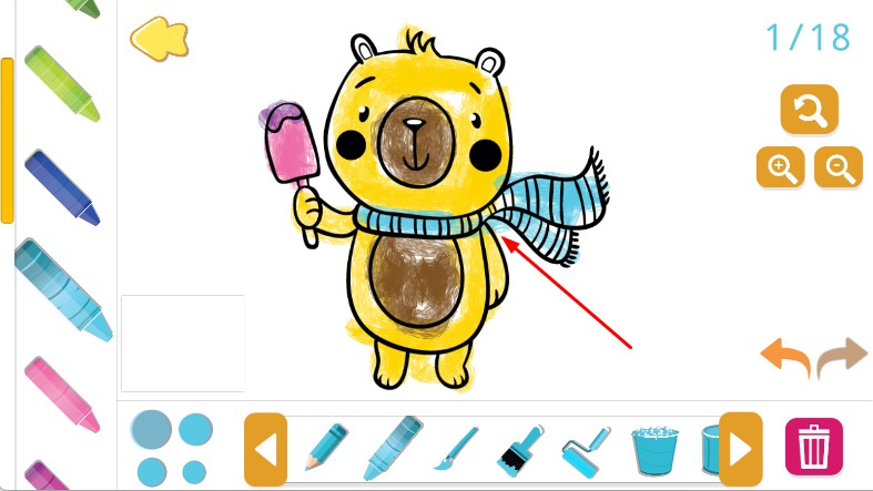 2、进入填色界面,左侧选画笔,下方选对应颜色,如红色、棕色,在图案区域,如小熊身体、围巾等,点击或涂抹上色。