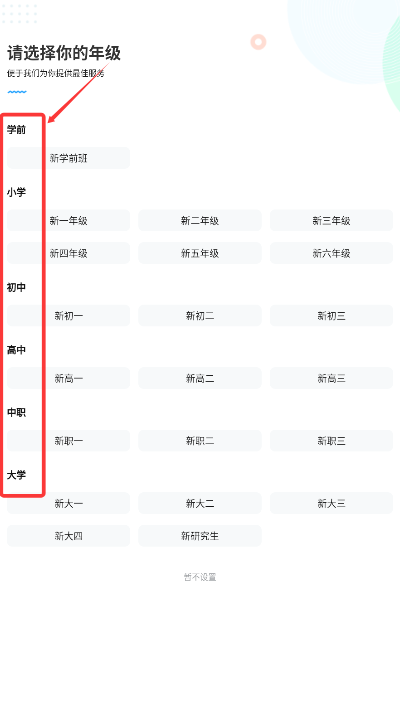 1、初次使用时,根据自身学段选择对应年级,涵盖幼教至基础教育全阶段。