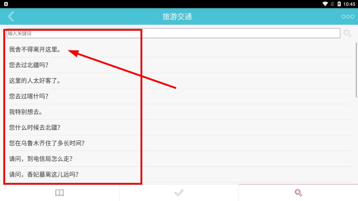 2、进入旅游交通的板块,浏览左侧语句列表,点击选中语句,学习旅游场景常用表达,辅助出行交流。