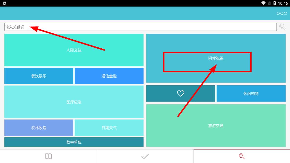 3、在分类页面,通过顶部【输入关键词】搜索,或点击【问候祝福】等,查找对应场景用语,系统学习语言表达。