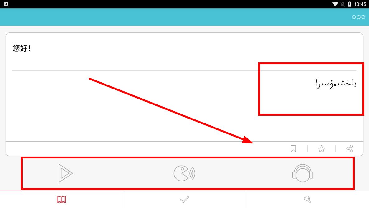 1、在对话界面,点击右侧维吾尔语ياخشىمۇسىز及下方播放、语音、耳机图标,可听语音、切换播放模式,学习基础用语发音。