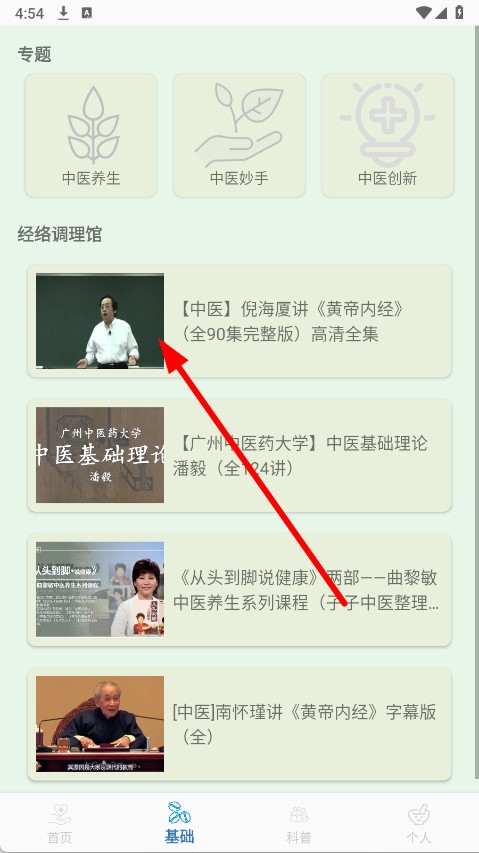 2、在基础学习页面的经络调理馆板块中,找到并点击视频条目。