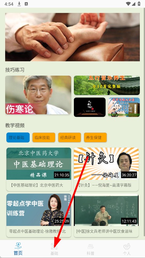 1、打开APP,点击底部导航栏的基础选项,进入中医基础学习页面。