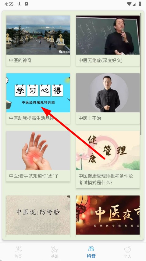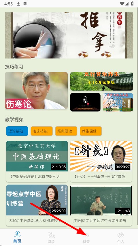 1、打开APP,点击底部导航栏的科普选项,进入中医科普内容展示页面。