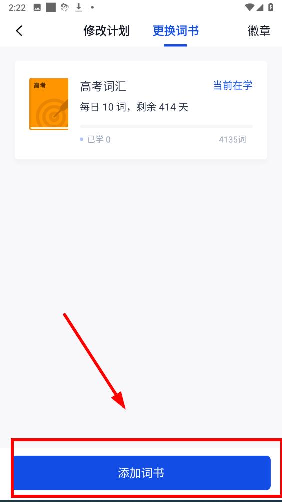 2、进入的页面在此处能查看当前词书,点击顶部的更换词书选项。