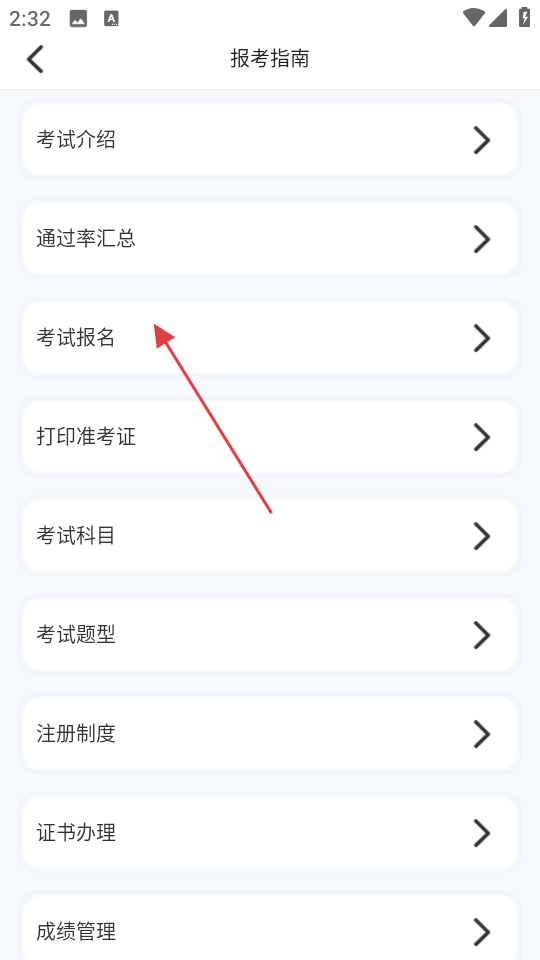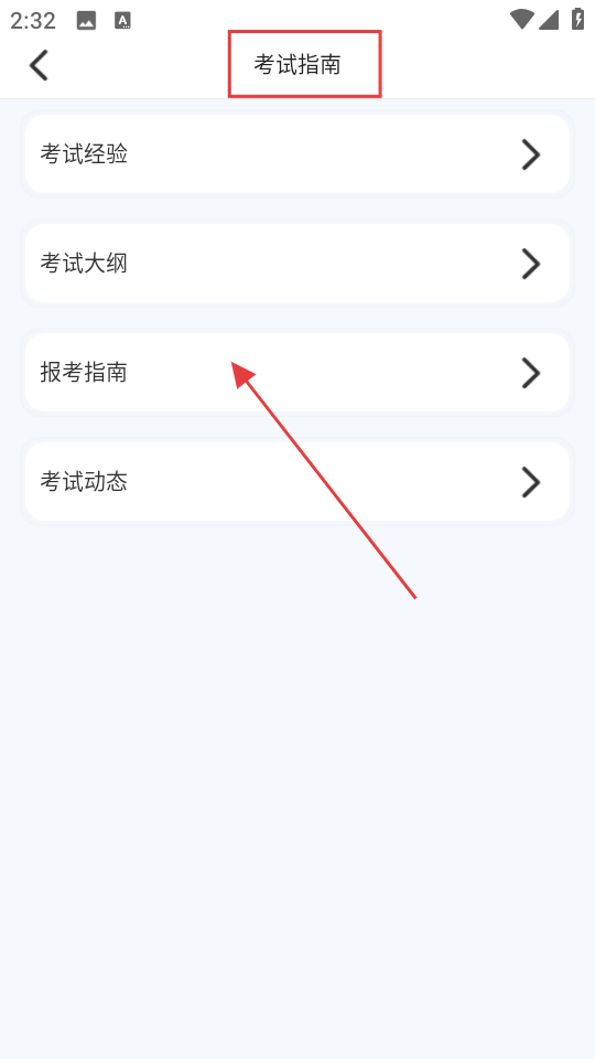 1、进入考试指南页面,可查看考试经验等内容,点击报考指南。