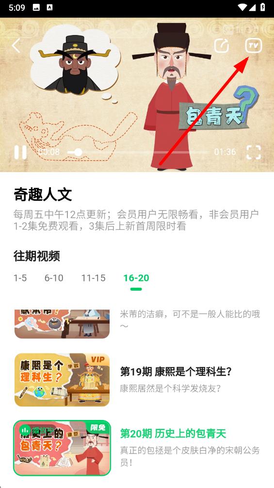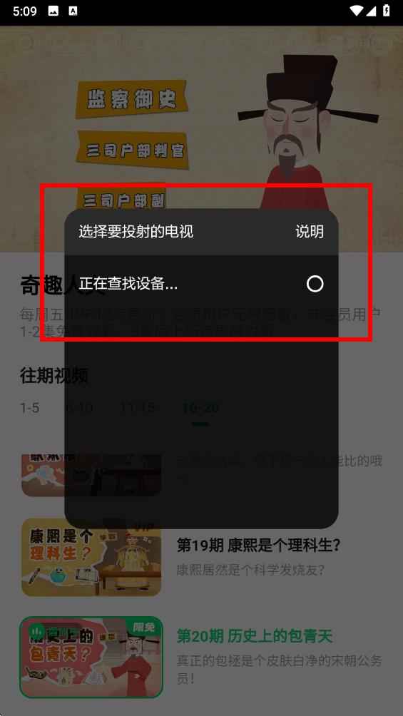 3、进入需要投屏的视频后点击视频界面右上角TV投屏图标,等待软件查找投屏设备。