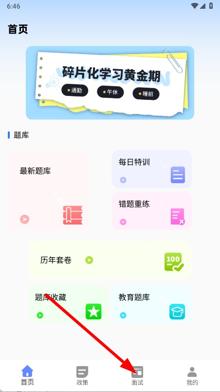 1、打开公考宝典APP首页,点击底部的面试按钮。