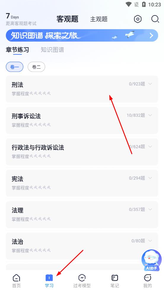 1、打开觉晓法考App,进入学习选项,选择想要练习的科目和试卷。