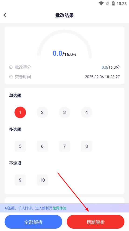 4、交卷后进入批改结果页面,点击错题解析按钮。