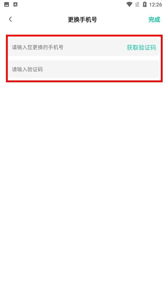 4、在更换手机号页面输入要更换的新手机号后获取验证,将验证码填入对应输入框点击完成即可完成手机号更换。