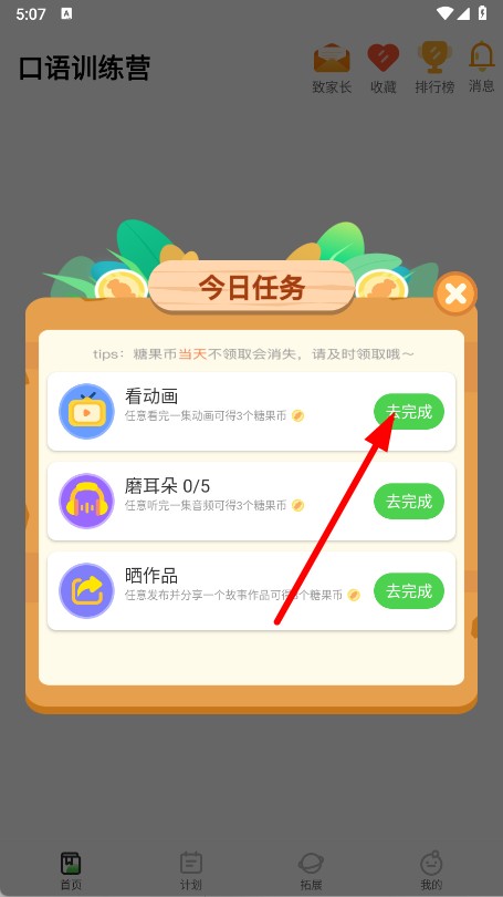 2、培养每日口语学习习惯:设置固定的每日学习提醒,告诉孩子完成学习任务后可获得小奖励,引导孩子每天主动打开软件学习,逐步让定时学口语成为孩子的日常习惯。