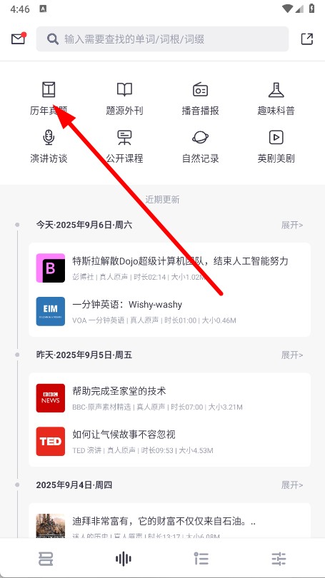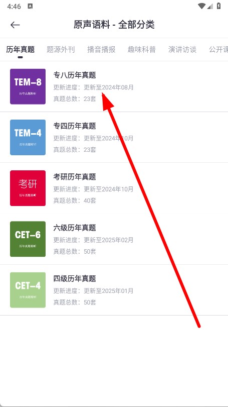 2、在原声语料全部分类页面,点击专八历年真题。