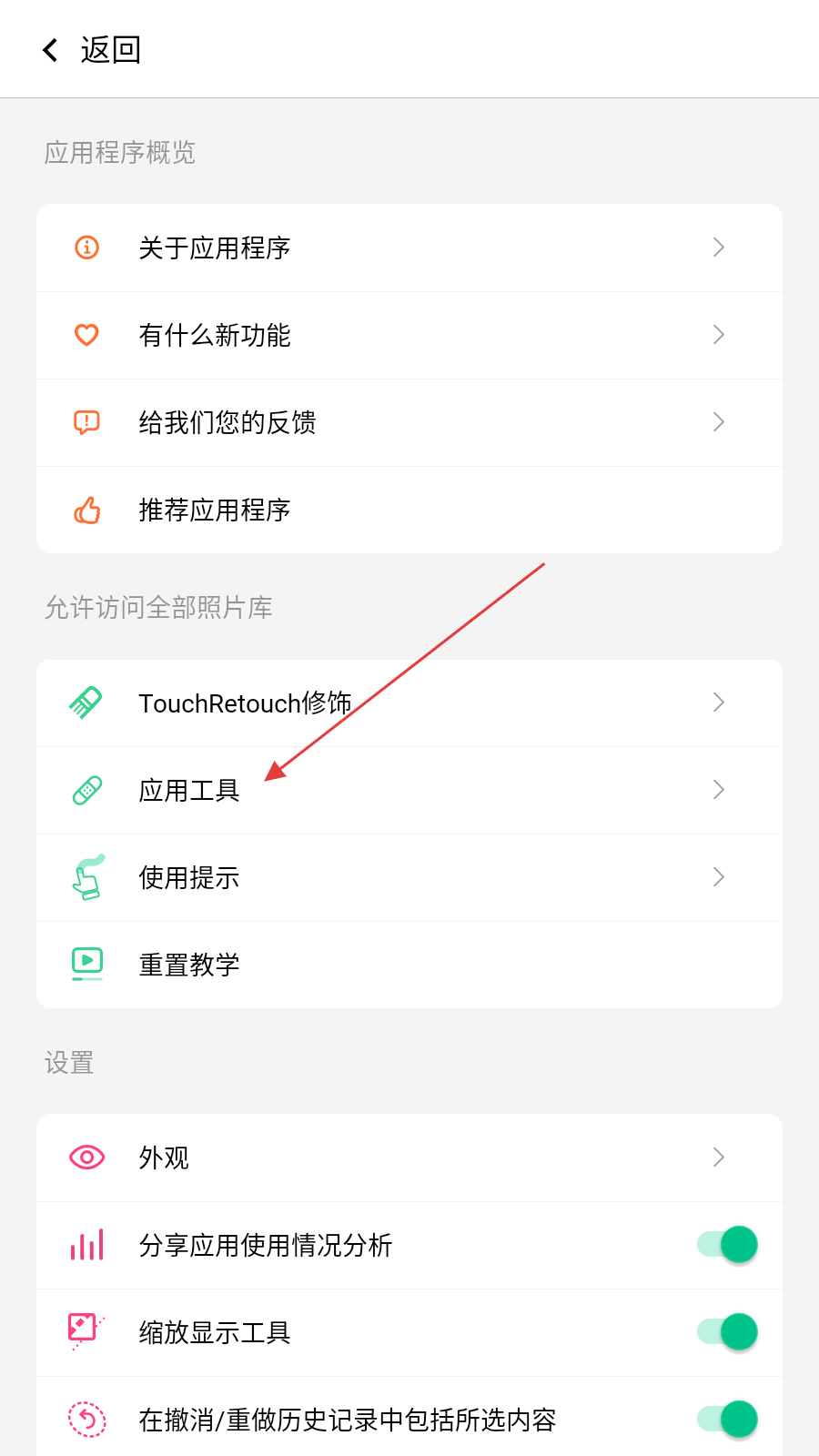 2、在功能选择页面中,找到并点击应用工具选项,进入工具详情界面。