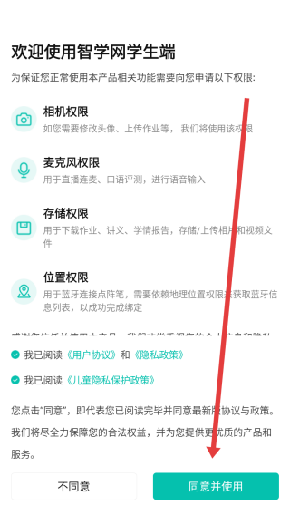 1、在打开智学网学生端app后,可以点击窗口中的同意并使用按钮,进入使用。