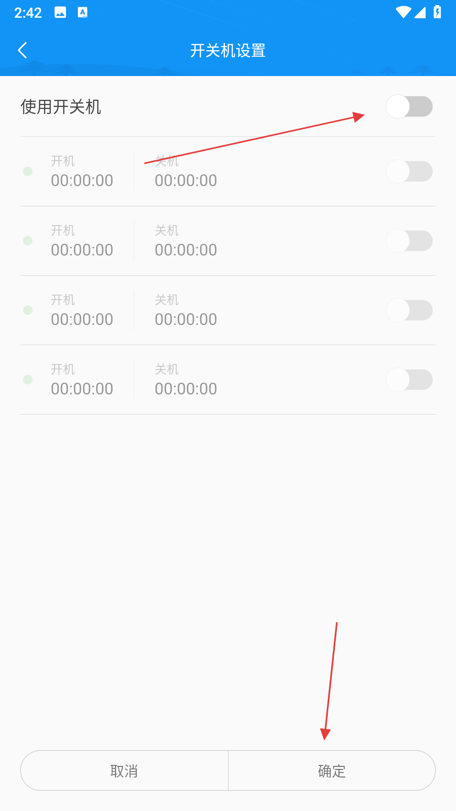 3、点击使用开关机右侧的开关将其打开,随后可设置多个时间段的开机和关机时间,设置完成后,点击页面底部的确定按钮保存配置。