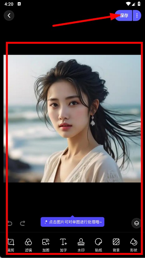 4、用底部的工具对图片进行个性化处理,编辑完成后,点击保存按钮。