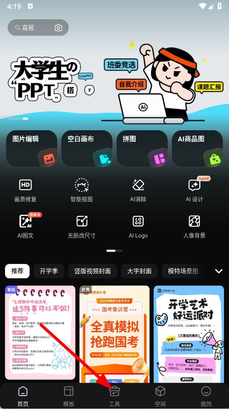 1、打开美图设计室,点击底部导航栏的工具选项。
