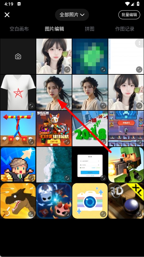 3、进入图片选择页面后,从全部照片列表中挑选需要编辑的图片并点击。