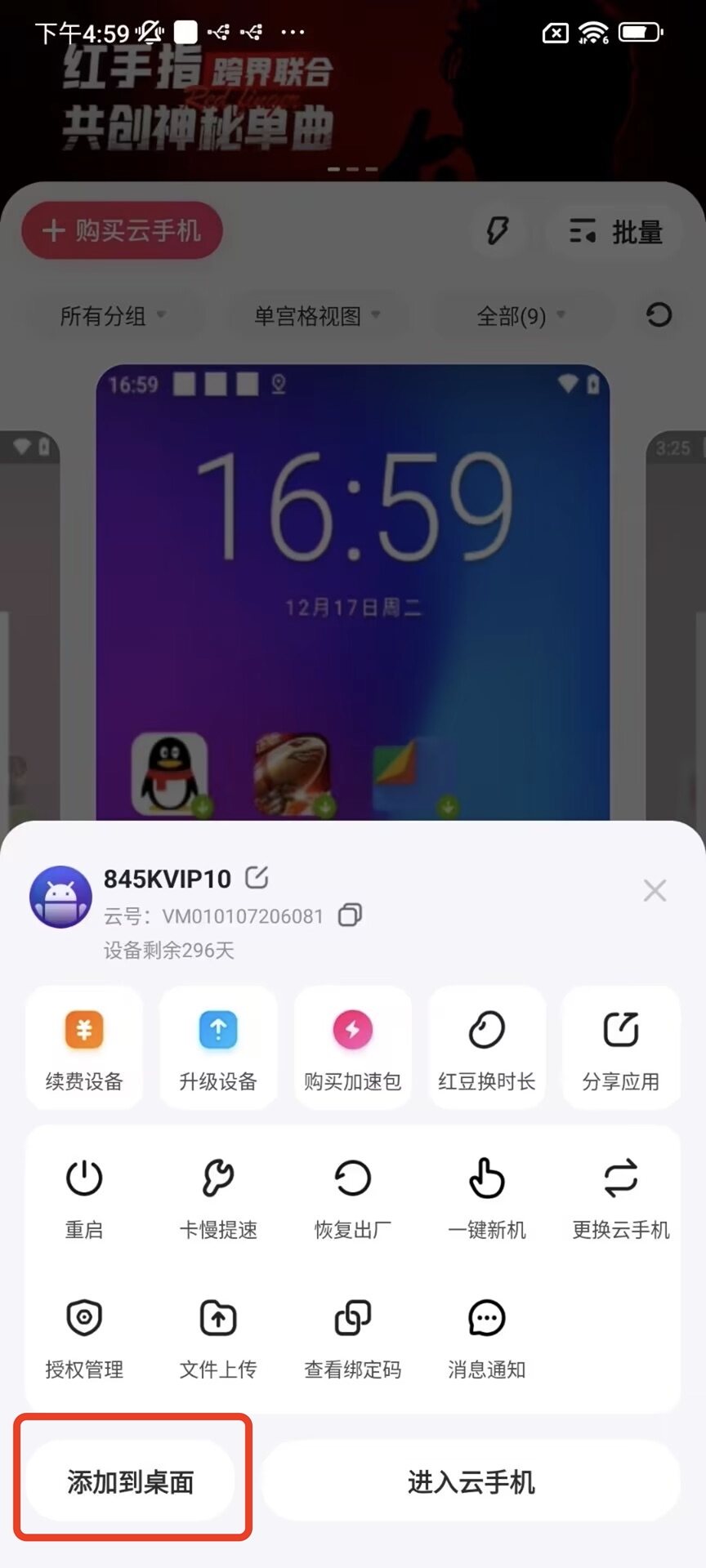1.长按需要设置的云手机,弹出悬浮窗,点击左下角【添加到桌面】按钮!
