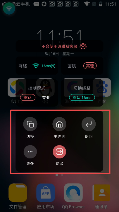 1.点击虚拟安卓云手机桌面的悬浮功能窗,即可呼出虚拟云手机功能操作菜单,包括切换控制模式、画质、线路等多重功能。默认模式下云手机功能悬浮窗始终置顶悬浮在最顶层。