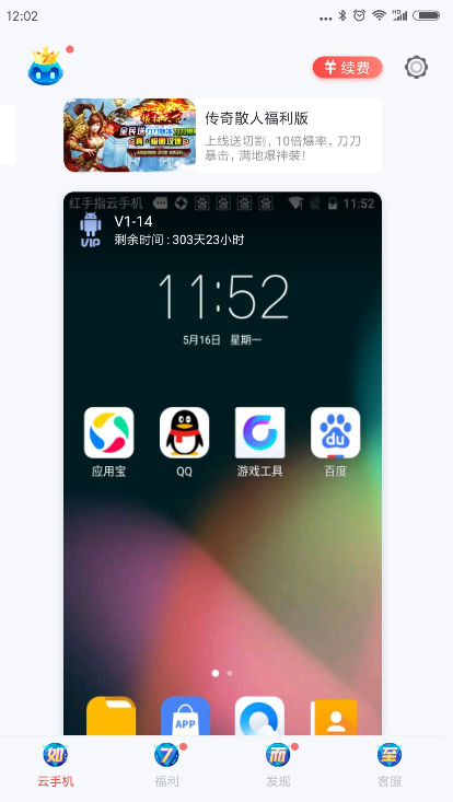 3.点击上图中的“退出”按钮,可以退出虚拟云手机,返回红手指APP主界面,即云手机类表界面。