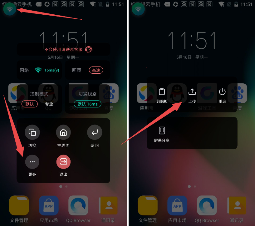 通过文件上传功能,支持安卓云手机内未上线的手游或应用、其他文件上传,支持用户的个人挂机需求;点击安卓云手机功能悬浮窗――更多功能――上传;