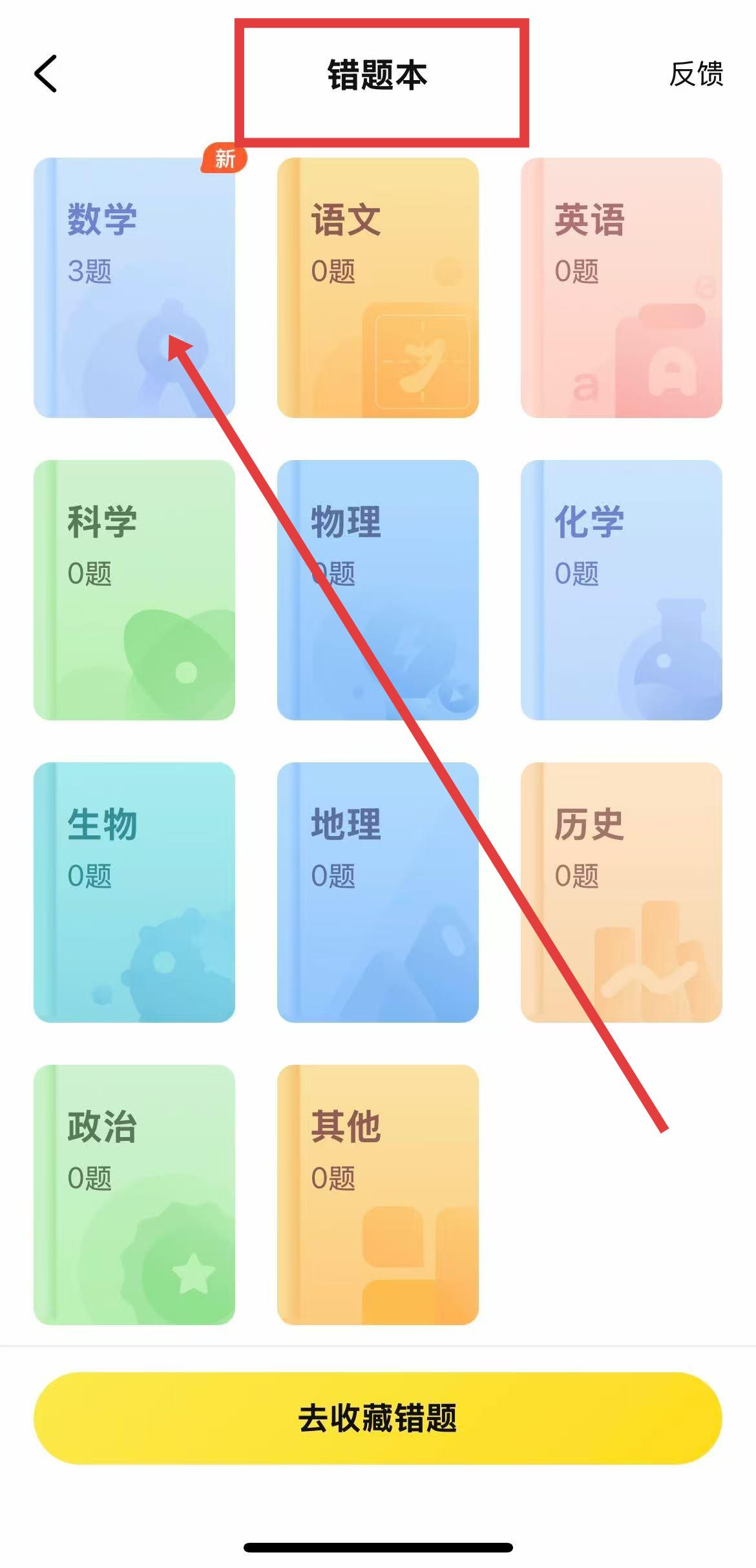 3、进入错题本页面后,选择对应的学科,就可以查看其中记录的搜题等相关题目。