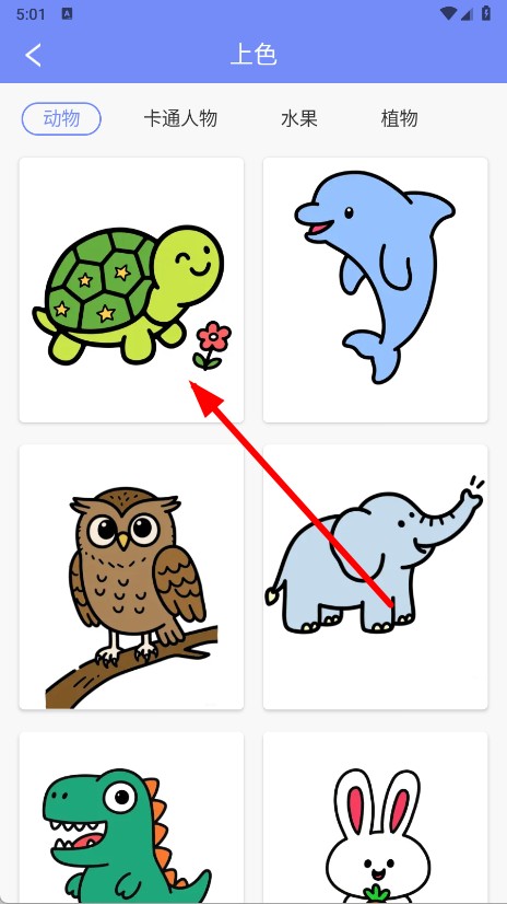 2、进入上色页面后,选择想要上色的卡通图案并点击。