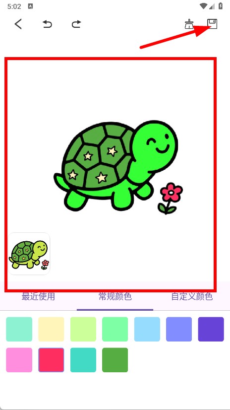 4、完成上色后,点击界面右上角的保存图标,即可将上色后的卡通图案保存到设备中。