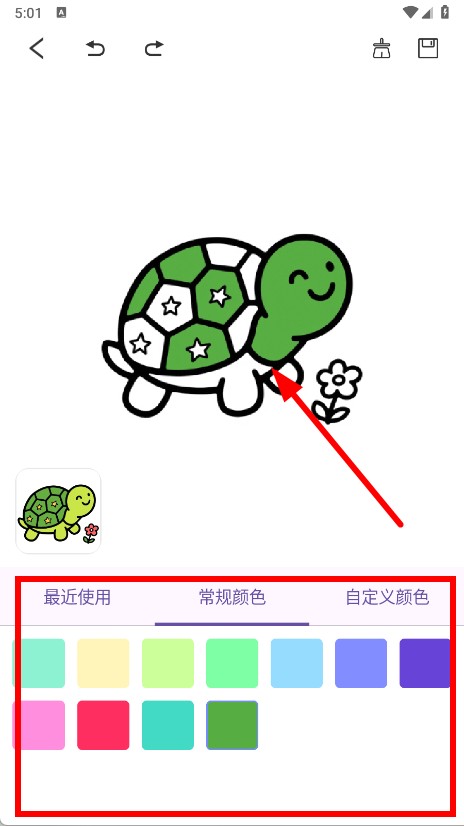 3、从底部的最近使用,常规颜色,自定义颜色区域中挑选颜色,点击图案的相应区域进行上色。