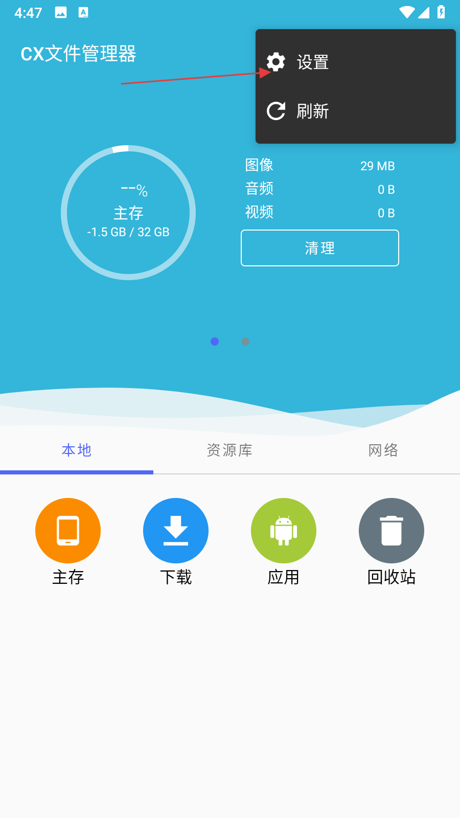 1. 打开CX文件管理器,点击界面右上角的三点菜单图标,展开功能选项。