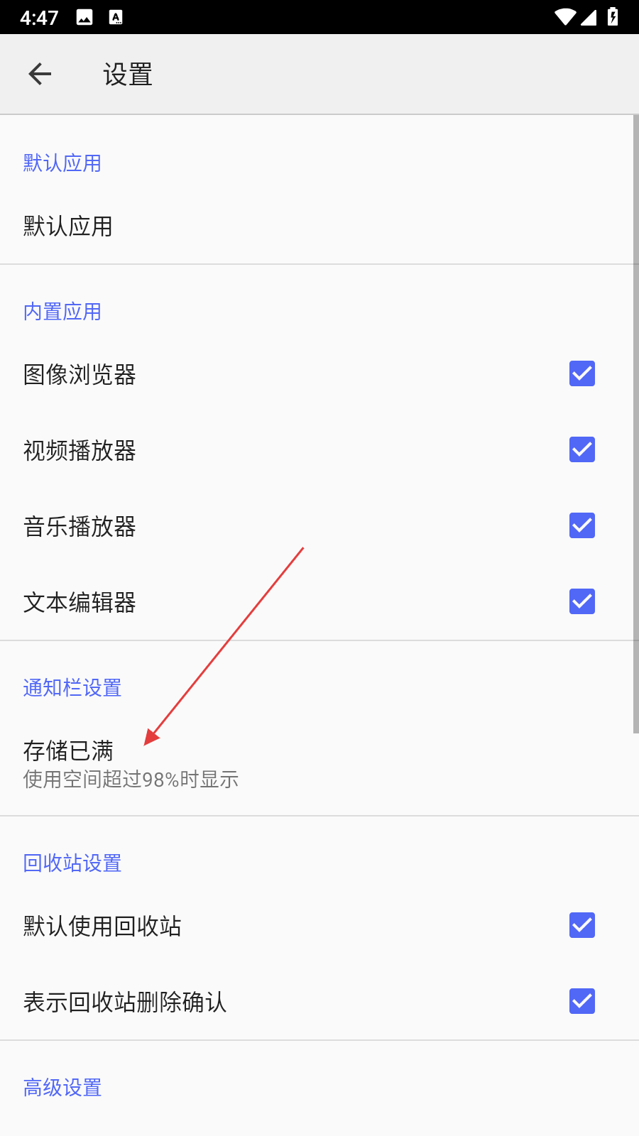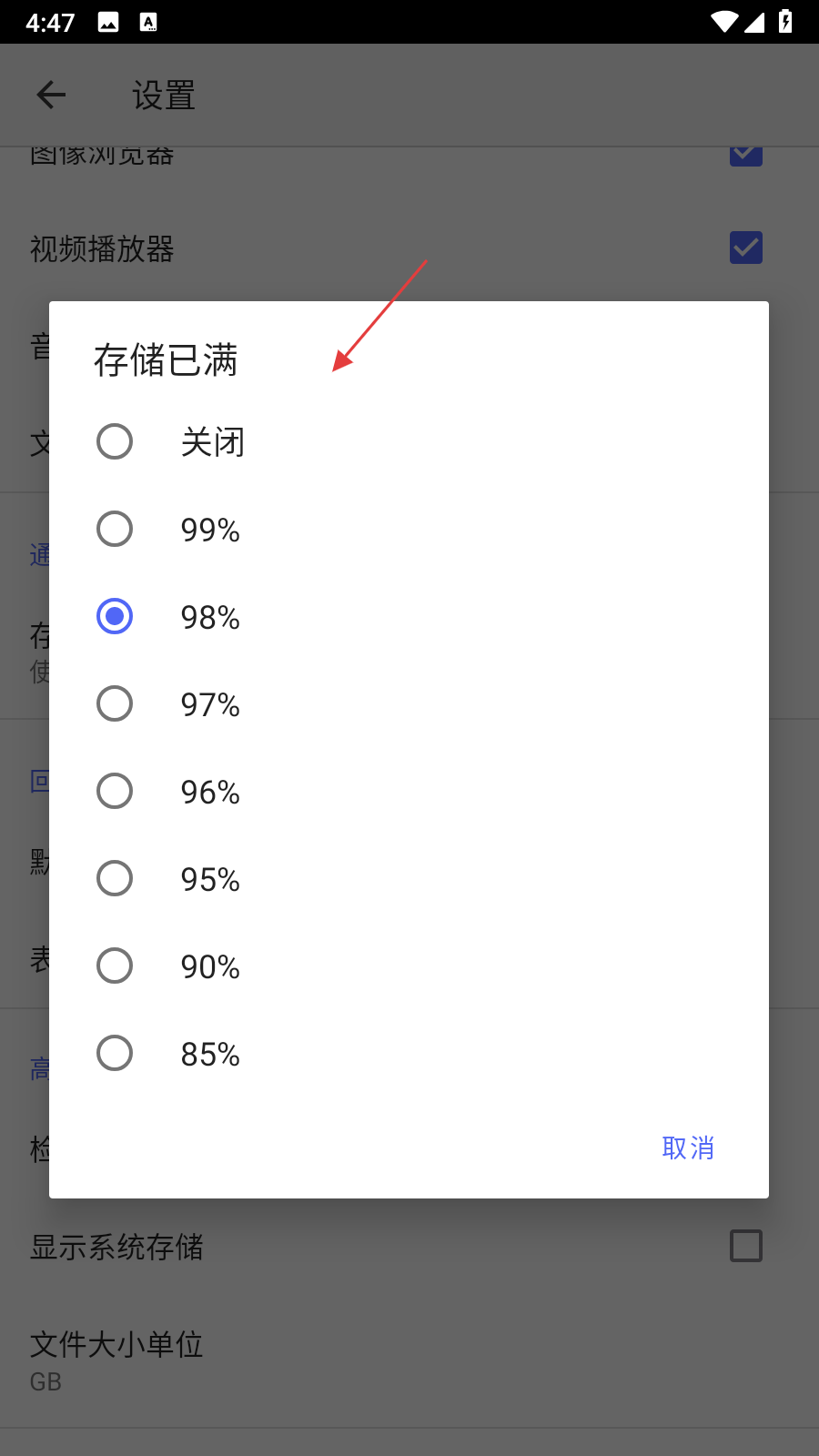 3. 在设置页面里,找到存储已满选项,点击该选项,弹出存储已满的触发阈值选择框。
