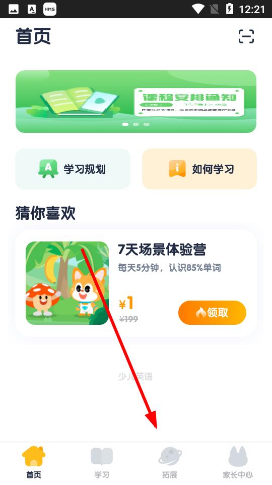 1、打开流利少儿英语APP,点击底部导航栏中的拓展图标。